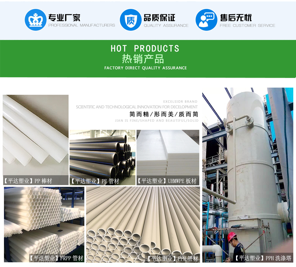 镇江平达塑料防腐管材有限公司生产企业地处素有江中明珠,水上花园城市之称的长江岛市——扬中。公司一直选用质量优异的管道专用原材料,安装了全套目前世界高新的德国巴顿菲尔挤出加工设备,建立了设备_高新的测试中心和实验室,还建立了技术安装服务部,为用户在工程设计、安装施工、管理等方面给予强有力支持。主要生产PP管材,FRPP管材,PPH管材,PVDF管材,FRPP管,管材及管件、板材、棒材、阀门等产品,安装维修方便、工程造价低等优点,已广泛应用于给水工程、排水工程、排污工程、农田灌溉工程、腐蚀性液体输送工程、光纤电缆护套工程等领域。